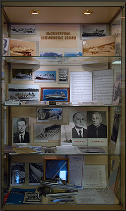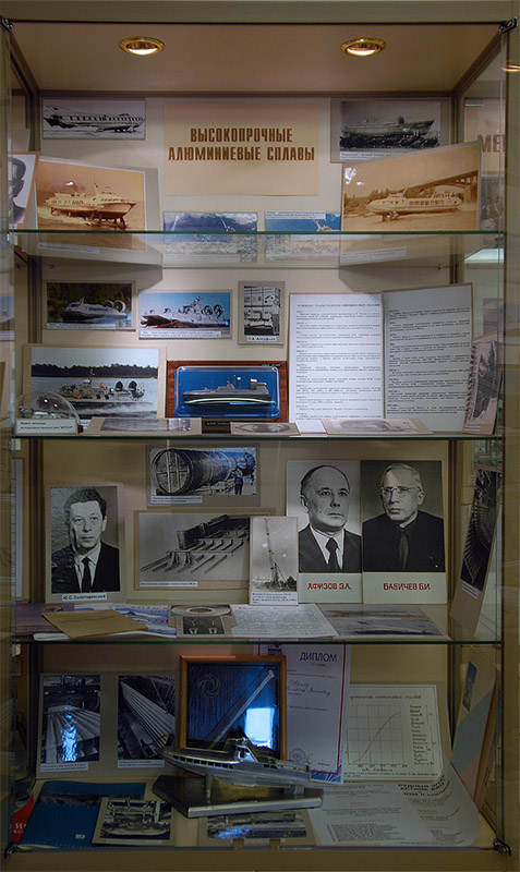 Алюминиевые сплавы В середине 50-х годов в стране возникла необходимость создания для ВМФ скоростных кораблей с динамическими принципами поддержания (ДПП). В 1955 году институт приступил к разработке свариваемых коррозионно-стойких деформируемых алюминиевых сплавов. Организуется подразделение по разработке алюминиевых сплавов во главе с к. т. н. Борисом Ивановичем Бабичевым. В конце 50-х годов коллективом ученых института (Борис Иванович Бабичев, Юлий Семенович Золоторевский, Эшреф Афизович Афизов и др.) был создан первый морской коррозионно-стойкий деформируемый сплав АМг61 (1561). Одновременно был успешно решен комплекс вопросов по сварке алюминиевых конструкционных сплавов, была разработана технология получения из них крупногабаритных полуфабрикатов — панелей, листов, труб, профилей. Всего из разработанных институтом алюминиевых сплавов было построено более 8000 судов и кораблей с ДПП — от прогулочных судов на подводных крыльях «Комета» и «Метеор», предназначенных для перевозок туристов, до самого большого в мире корабля на воздушной подушке типа «Зубр», водоизмещением 555 тонн.