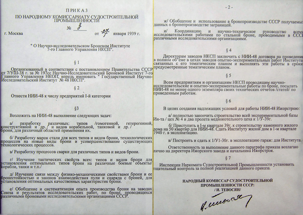 В связи с возрождающейся идеей „Без сильного флота нет сильной державы“ были созданы В 1939 году Приказом № 3 от 27.01.39 г. Наркома судостроения Ивана Федоровича Тевосяна институт становится НИИ-48 Наркомата судостроительной промышленности. Эту дату — 27 января 1939 года институт считает днем своего рождения. ← Вступление Предвоенные и военные годы → © ФГУП ЦНИИ КМ «Прометей»