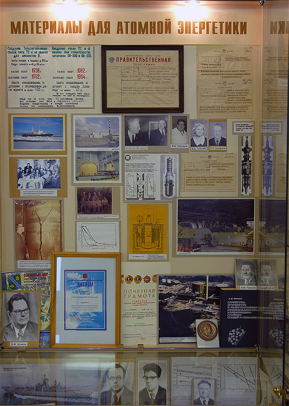 Высокопрочные радиационно стойкие Одним из главных направлений деятельности института во второй половине 50-х годов становится создание материалов для атомной энергетики. Оно имело очень большое значение, как для обороноспособности, так и для экономики страны в период становления и развития атомных станций. 1955 год. Страна строит атомный Флот. Институту поручена разработка высокопрочных радиационно стойких основных и сварочных материалов для атомных энергетических установок, а также технологий, обеспечивающих изготовление базового оборудования для АЭУ. С применением материалов, разработанных институтом, был построен атомный подводный флот, насчитывающий более 300 АПЛ. Одна из первых разработок — теплоустойчивая сталь 48ТС для водо-водяных реакторов. Руководили работами директор Г. И. Капырин и главный инженер И. В. Горынин. В группу входили: Сергей Сергеевич Шураков, Елизавета Дмитриевна Теплова, Петр Осипович Пашков, Вадим Георгиевич Марков и другие. Работы по созданию сварочных материалов и технологии сварки возглавлял Василий Васильевич Ардентов — крупный ученый, великолепный организатор, человек широкой эрудиции.