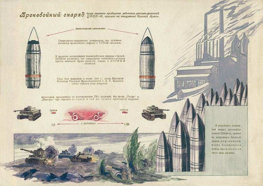 Фронтовые бригады института В танковых частях работали фронтовые бригады ЦНИИ-48, они обследовали и обобщали данные о поражаемости танков, доводили эти сведения до производства и КБ с предложениями по улучшению бронестойкости танков. В войска же передавались инструкции с указанием уязвимых мест наших и немецких танков. Отечественные конструкторы получали возможность выбирать бронирование не умозрительно, а руководствуясь надежной теорией. В результате исытаний, исследований и рекомендаций ЦНИИ-48 снаряд с острым оживалом был принят на вооружение и запущен в производство, были созданы и распространены инструкции по уничтожению вражеских танков .