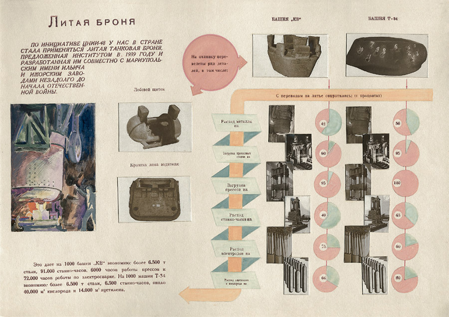 То, что во время Великой Отечественной войны наши танки типа Т-34, КВ, ИС по своим техническим характеристикам превосходили свои германские аналоги, - положение общепринятое и в особоых доказательствах не нуждается. Достаточно привести свидетельсва противника. "Их Т-34 был лучший в мире", — признавался генерал-фельдмаршал Клейст, командовавший 1-й танковой армией, главной ударной силой гитлеровцев на южном направлении. В работах под непосредственным руководством и при участии А. С. Завьялова были заняты научные сотрудники, инженеры, лаборанты, многие из которых впоследствии стали видными учеными-материаловедами. А тогда все силы отдавались Победе. Сергей Сергеевич Шураков, будущий лауреат Ленинской премии и Заслуженный деятель науки и техники РФ, а тогда молодой инженер, о работе на военном заводе в Челябинске вспоминал: „Очень часто приходилось спать в цехе. Но работали мы с энтузиазмом. Мы были молоды и имели столько сил“., Семен Израилевич Сахин возглавлял бронепроизводство Магнитки, которая давала 50% всей брони в стране. Ксения Николаевна Тимошенко в 1943 году одна на военном полигоне в Кубинке под Москвой проводила отстрел наших подбитых танков трофейными снарядами на разных дистанциях и углах обстрела. На основе полученных данных были построены диаграммы безопасного положения танков. Это вошло в копилку создания танка ИС. Георгий Иванович Федосеенко — его автограф с расчетами, посвященными изучению поведения снарядов, хранится в экспозиции.