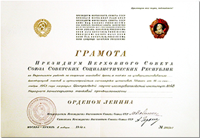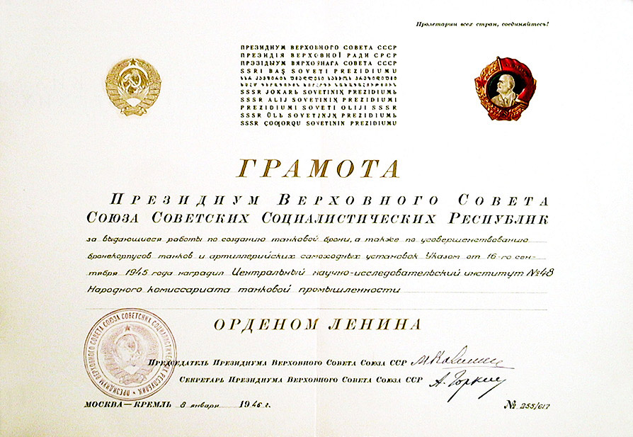 Орден Ленина В ходе войны институт стал многопрофильным НИИ, одним из ведущих материаловедческих центров СССР. В мае 1945 г. настала долгожданная Победа, и 16 сентября тогоже года вышел Указ Верховного Совета СССР о награждении НИИ-48 орденом Ленина за выдающиеся работы по созданию танковой брони, а также по усовершенствованию бронекорпусов танков и артиллерийских самоходных установок.
